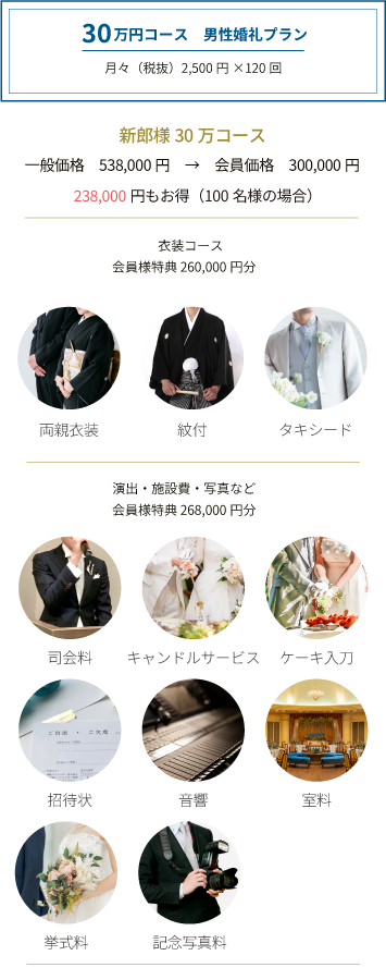 夢見ている憧れの結婚式に備えて、少しでも積立をして準備しておきたい。成長した子や孫の晴れの門出を少しでも応援したい。そんな方にもお勧めのプランです。専属スタッフがあなただけのご要望にお応え致します。お気軽にご相談下さい。