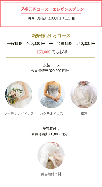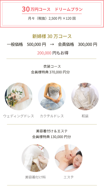 夢見ている憧れの結婚式に備えて、少しでも積立をして準備しておきたい。成長した子や孫の晴れの門出を少しでも応援したい。そんな方にもお勧めのプランです。専属スタッフがあなただけのご要望にお応え致します。お気軽にご相談下さい。