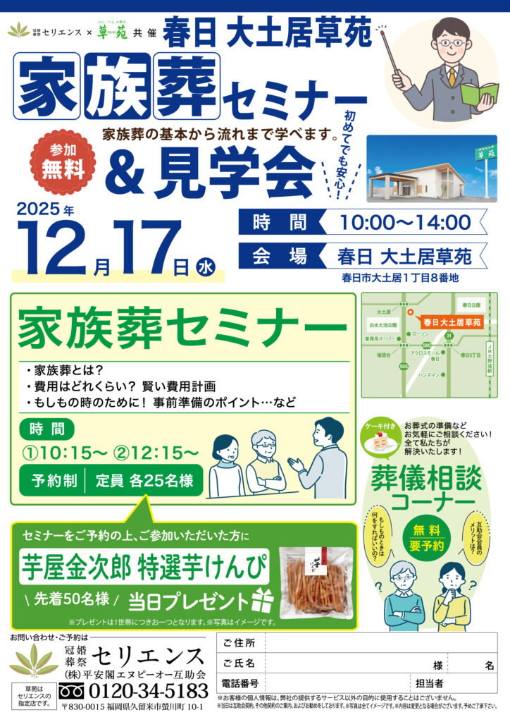 家族葬について基礎からしっかり学べる無料セミナーと、館内見学会を同日開催します。費用の目安や賢い準備、もしもの時の流れまで、スタッフが丁寧にご案内いたします。初めての方でも安心してご参加いただけます。