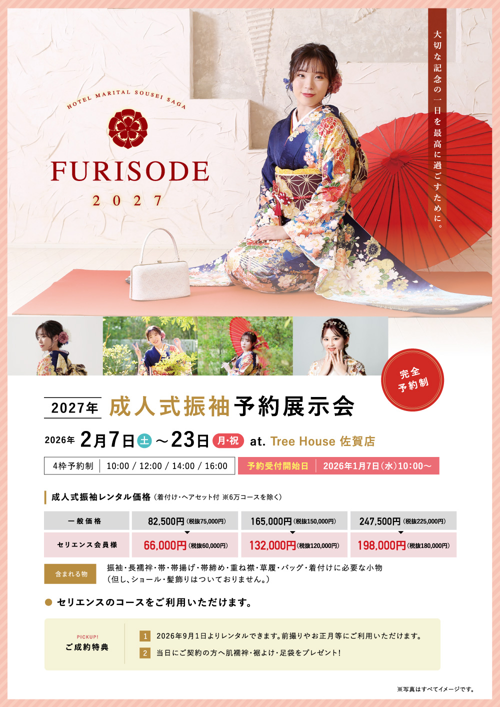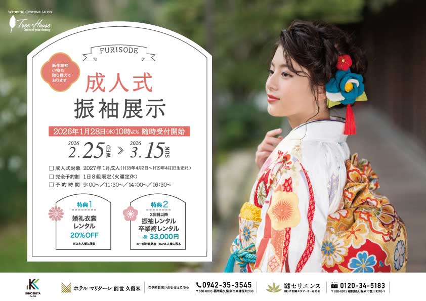 『ホテルマリターレ創世 久留米』・『ホテルマリターレ創世 佐賀』では、成人式を彩る振袖をご覧いただける特別展示会を開催いたします。気になる振袖をご自由にご試着いただけます。ご家族とご一緒に、ぜひお気に入りの一着をお選びください。大切な記念の日が、かけがえのない思い出になるよう、心を込めてお手伝いさせていただきます。