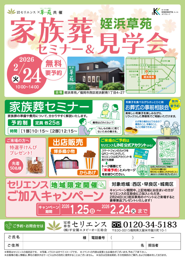 2/24(火)開催|姪浜草苑 家族葬セミナー&相談会[参加無料|要予約] 2026/01/25