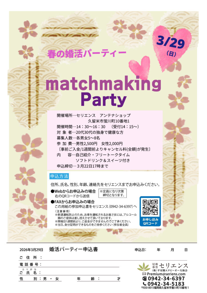 新しい出会いを探しませんか? 「セリエンス アンテナショップ」にて、春の婚活パーティーを開催いたします。
