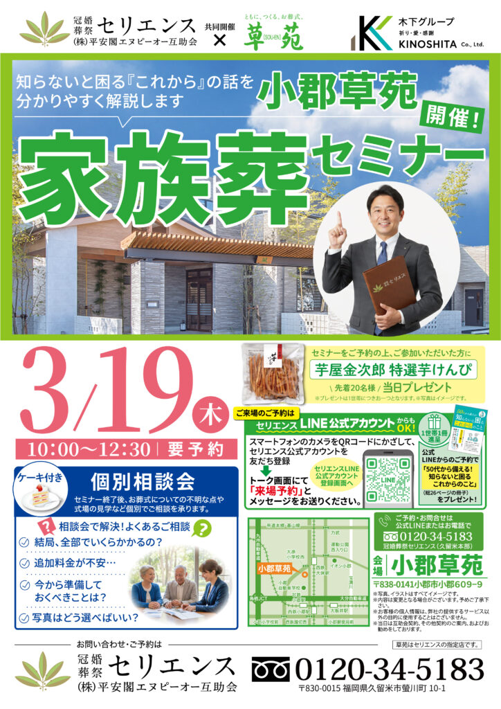 3/19(木)開催|小郡草苑「家族葬セミナー」|特選芋けんぴプレゼント&ケーキ付き個別相談会 2026/02/09