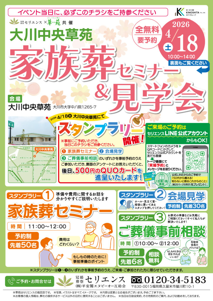 大川中央草苑にて、家族葬の疑問を丸ごと解決する「家族葬セミナー&見学会」を特別開催いたします。 当日は、セミナーや会場見学にご参加いただいた方へ、後日500円分のQUOカードを差し上げるスタンプラリーも実施!「何から準備すればいい?」「費用は?」といった不安を、この機会に安心に変えませんか?ご来場お待ちしております。