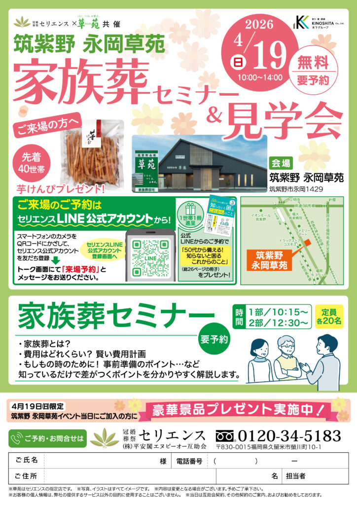 筑紫野市の皆さまのそんな不安を解消するため、永岡草苑にて「家族葬セミナー&見学会」を開催いたします。